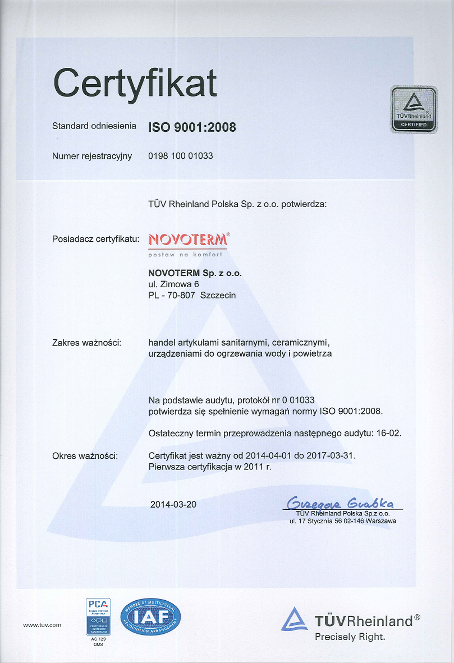 Po przeprowadzonym okresowym audycie od 01.04.2014 otrzymaliśmy nowy certyfikat potwierdzający działanie zgodnie ze standardami zarządzania jakością wg normy ISO 9001:2008.